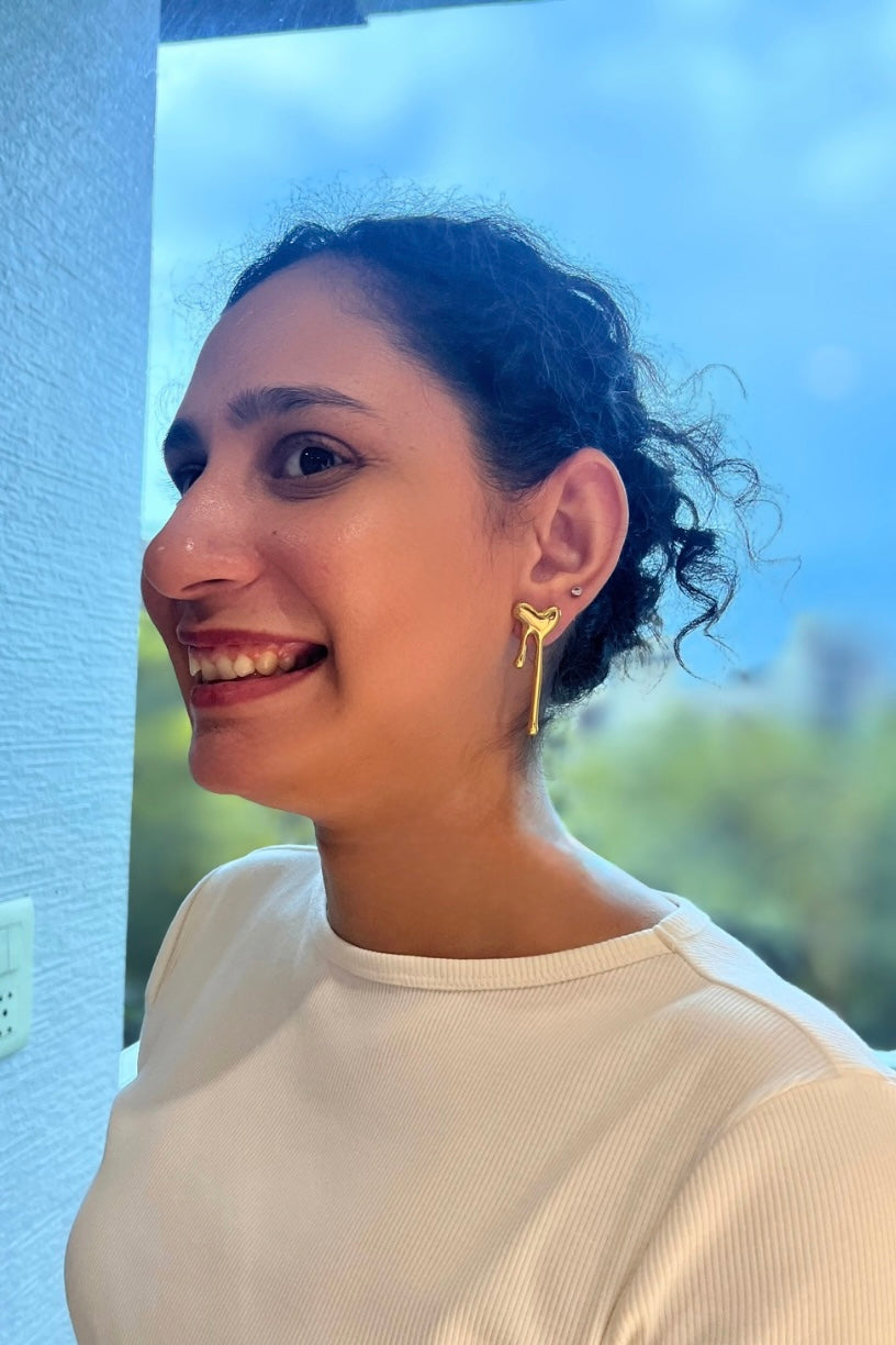 Delicately crafted in glossy gold plating, the Heartstrings earrings are a romantic ode to love’s unspoken connections. With their fluid, melting-heart silhouette, they capture the softness of emotion and the strength of timeless design. Lightweight yet striking, they’re perfect for adding a touch of elegance—whether to an intimate dinner or an everyday ensemble.